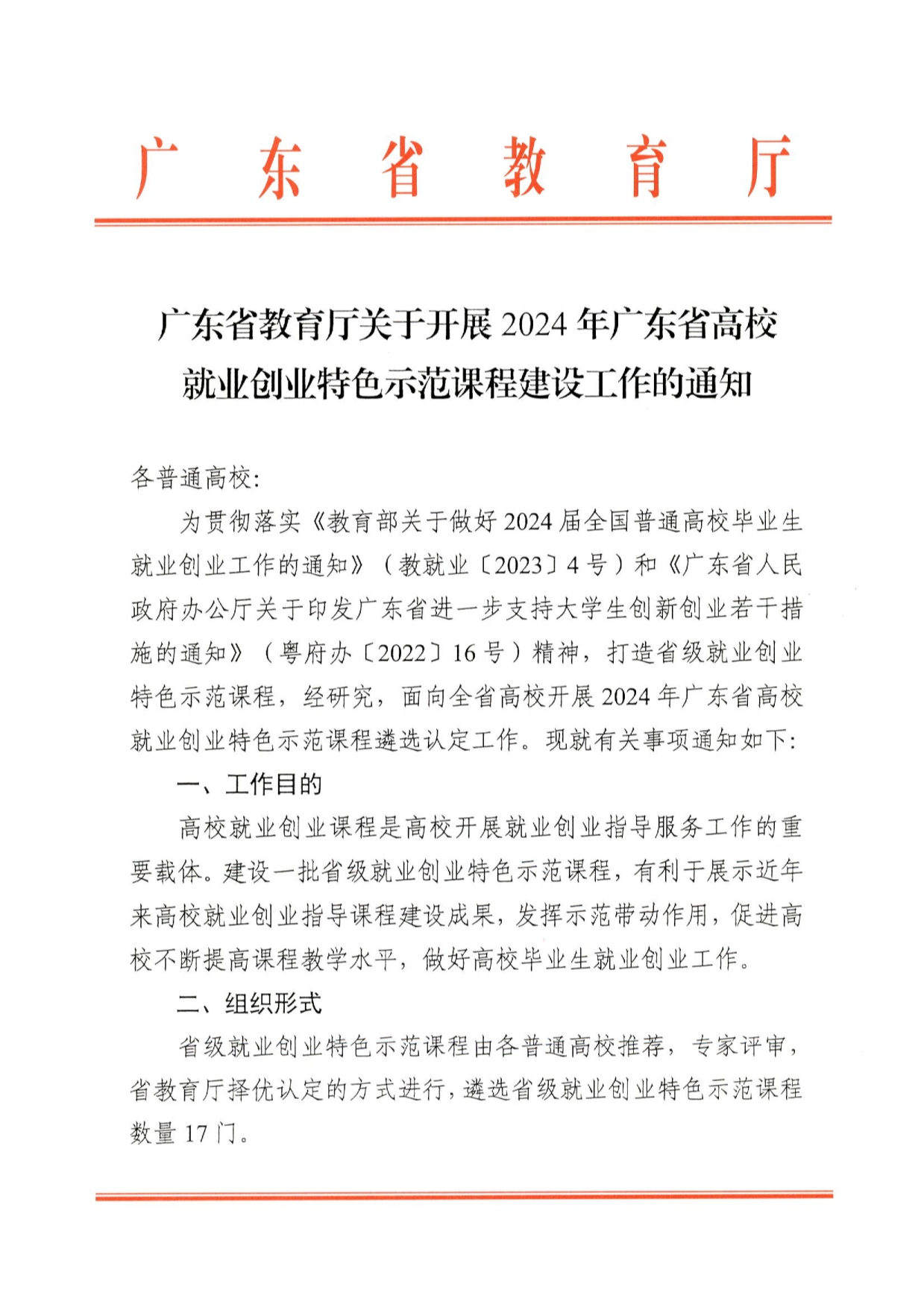 廣東省教育廳關于開展2024年廣東省高校就業創業特色示范課程建設工作的通知